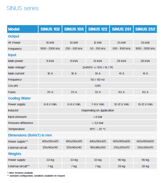 Frequency: 10-30 kHz (requires the use of a lower frequency generator, SINUS series with a minimum frequency of 50kHz is suitable for larger sizes)