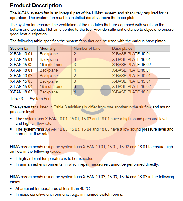 The X-FAN system fan contains moving parts and is a consumable with a lifespan. HIMA recommends regularly replacing fans and sending them back to HIMA for maintenance based on the operating environment temperature