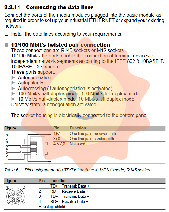 10/100 Mbit/s TP port: RJ45 or M12 connector, supports Auto MDI/X, pin allocation conforms to MDI-X mode.