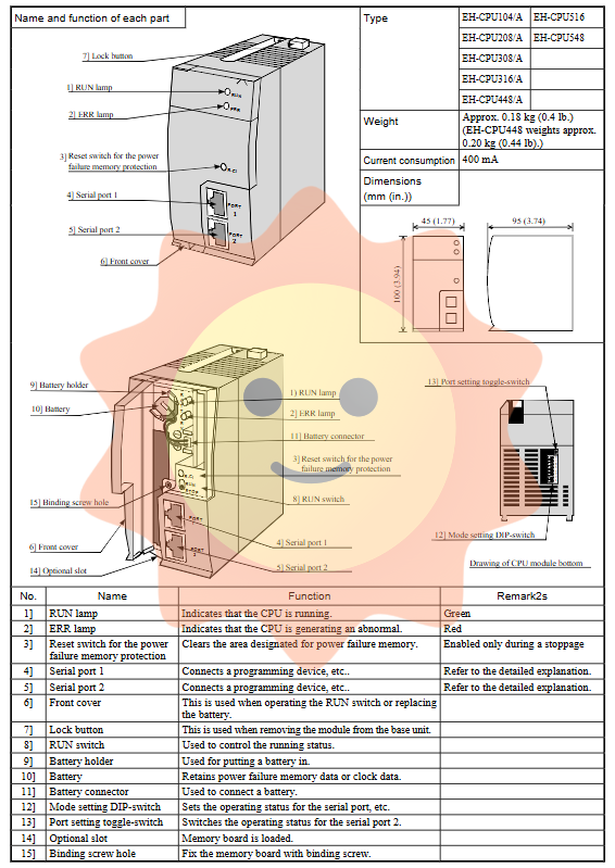 Built in modem interface: Specific CPU models (such as EH-CPU308 (A) and above) support connecting a modem on port 1 to monitor and maintain remote systems through the public telephone network.