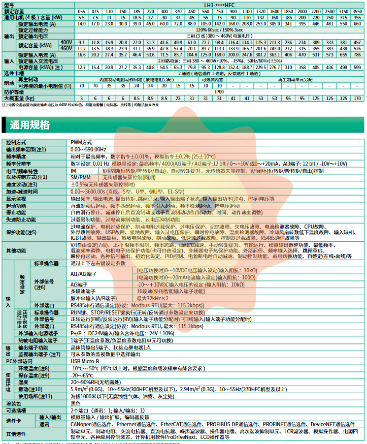 The LH1 series offers a rich selection of models, covering multiple power ranges of 400V, from 5.5kW to 355kW. Users can refer to the detailed specification table and standard applicable appliance list in the sample to choose the appropriate inverter model and peripheral accessories, such as circuit breakers, contactors, reactors, and braking resistors, based on motor power and application requirements.