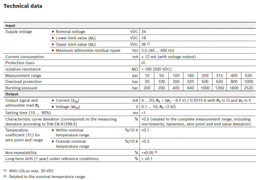 Measurement capability: Provides 8 measurement ranges (10 bar, 50 bar, 100 bar, 160 bar, 250 bar, 315 bar, 400 bar, 630 bar), using thin film measurement units, with excellent accuracy performance - characteristic curve deviation<0.5% (including nonlinearity, hysteresis, zero and endpoint deviation), non repeatability<± 0.05% (within the reference temperature range)