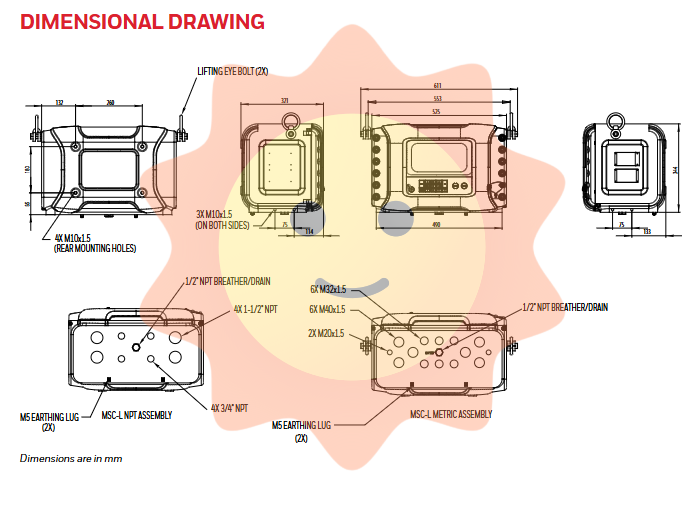 Dimensions 525 × 490 × 611 mm (including lifting ring)