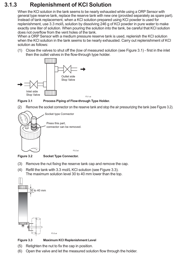 Universal Liquid Storage Tank (- TT1): When the remaining solution is less than 1/4, replace with a new liquid storage tank (accessory K9084KQ), or supplement with a 3.3mol/L solution (246g KCl dissolved in 1L pure water) prepared with KCl powder (K9020XU) to avoid reference electrode failure caused by an empty liquid storage tank;