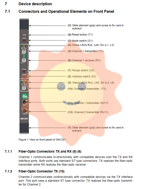 Topology: The output (Tx) of SM128V is connected to the ibaFOB acquisition card (input to ibaLogic). At the same time, the input (Rx) of SM128V is connected to the ibaFOB output card (output from ibaLogic). Form a bidirectional data stream.