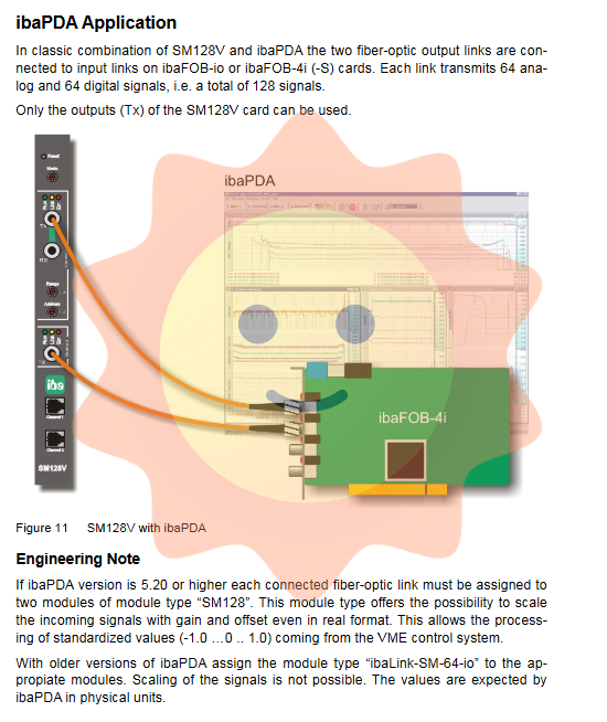 Engineering note: In ibaPDA 5.20 and above versions, two "SM128" modules can be assigned to each fiber link, supporting gain and bias scaling of signals. Early versions required the allocation of the "ibaLink-SM-64-io" module, which does not support scaling.