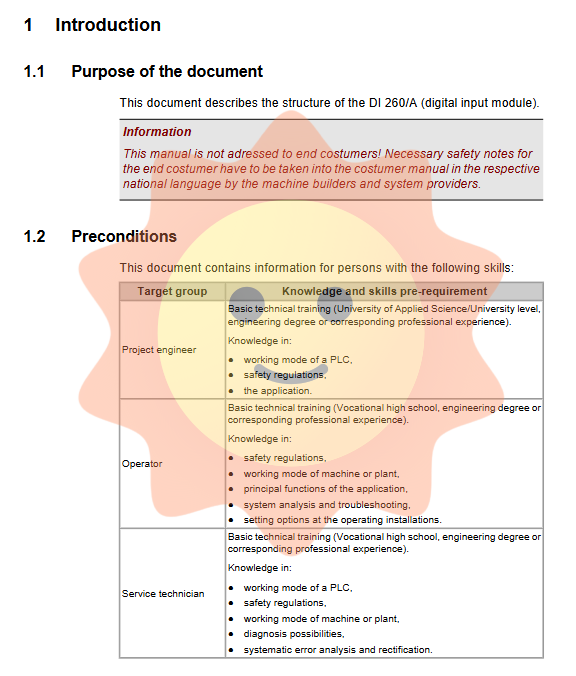 DI 260/A is a compact digital input module designed strictly in accordance with industrial control standards. The manual clearly states that this document is not intended for end customers, but is specifically designed for project engineers, operators, and service technicians of machine manufacturers and system integrators. This positioning determines that its content is deeply focused on the engineering implementation level, requiring readers to have a foundation in electrical engineering, PLC knowledge, understanding of safety regulations, and the ability to diagnose system faults. As an "open device" (compliant with EN 61131-2 and UL 508 definitions), the module must be installed in a control cabinet with sufficient protection level for use, which reflects the hard requirements of industrial products for basic security architecture.
