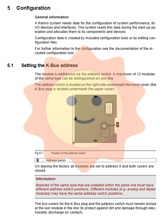 The DI 260/A is addressed through a 16 bit dip switch located on the right side of the module and under the protective cover. On the same K-Bus bus, up to 12 modules of the same type can be distinguished. At the factory, all module addresses are set to 0. During system integration, each module of the same type on the same bus must be assigned a unique address. But different types of modules (such as digital input and analog output modules) can have the same address. This is the foundation for implementing modular and scalable I/O systems. The manual emphasizes that the protective covers of K-Bus plugs and address switches located at the end of the bus must be kept locked to prevent dust and static electricity.