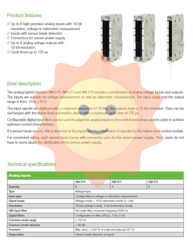 AM series analog hybrid module: innovatively integrates high-precision analog input and output on the same module. For example, the AM 570/571/572 integrates up to six 16 bit inputs and four 12 bit outputs, and the AM 575/577 integrates current input and output, providing an ideal choice for complex measurement and control tasks with limited space.