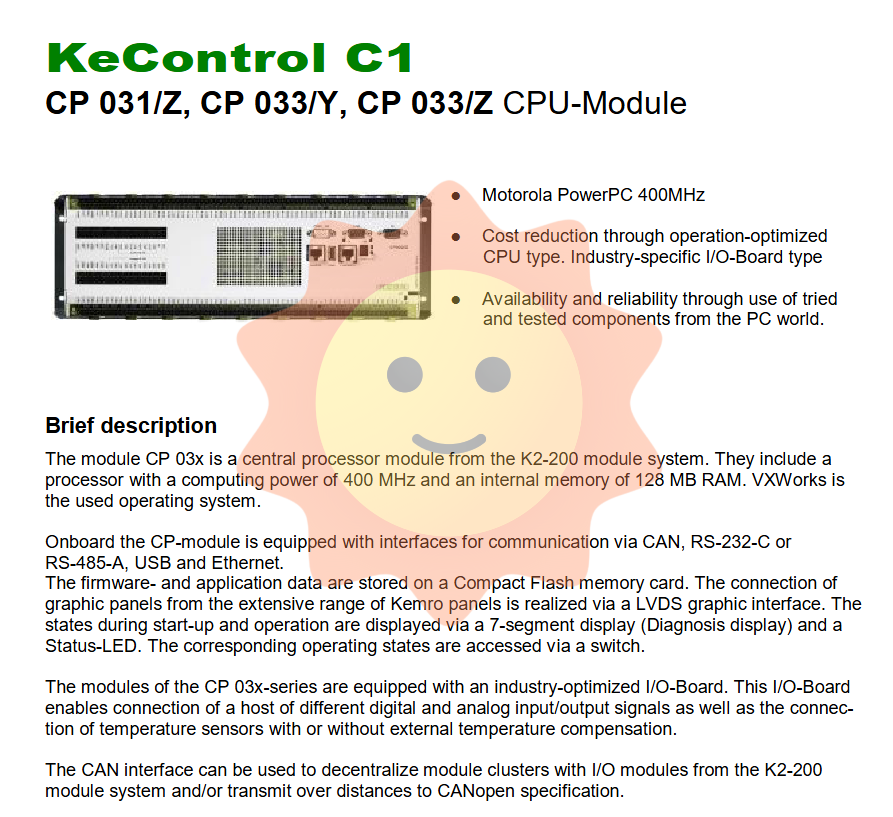 In the field of industrial automation, especially in large-scale equipment such as injection molding, die-casting, extrusion, etc., controllers not only require powerful computing cores, but also must directly face hundreds or thousands of sensors and actuators, and complete closed-loop adjustment under strict real-time requirements. The CP 031/Z, CP 033/Y, and CP 033/Z CPU modules in the KEBA KeControl C1 series are tailor-made embedded controllers for such scenarios. They are based on Motorola PowerPC processors, equipped with VxWorks real-time operating system, and integrate massive digital I/O, high-precision analog channels, dedicated temperature measurement interfaces, and multiple industrial bus interfaces on the same hardware platform, achieving a highly integrated control solution of "one machine, one cabinet".