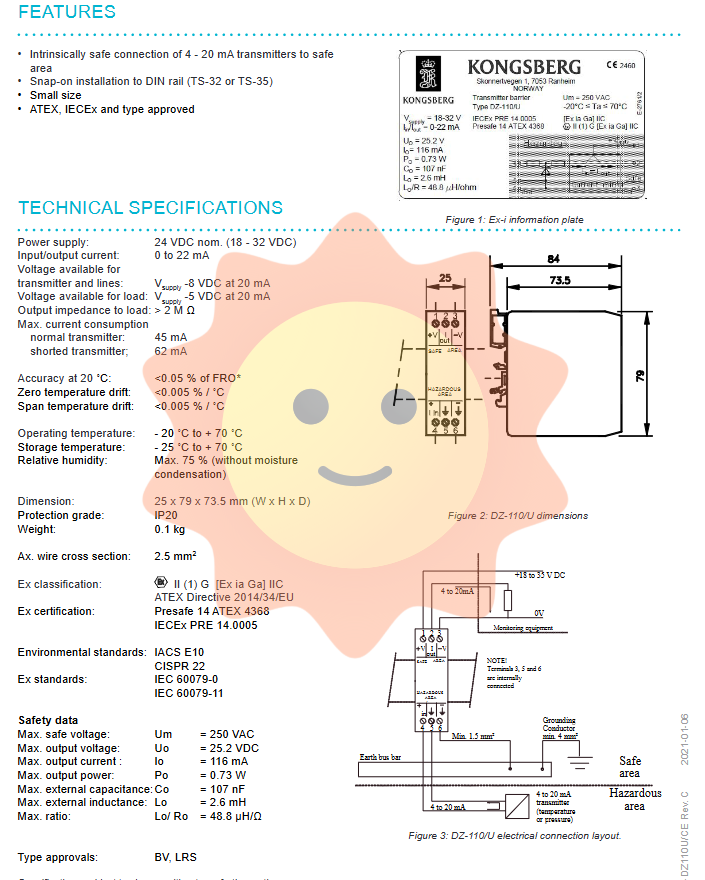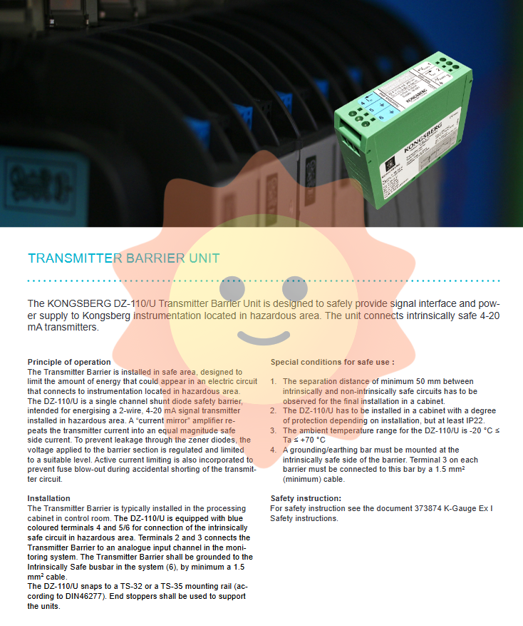 Characteristics: DZ-120 Zener safety barrier, DZ-110/U transmitter isolation barrier