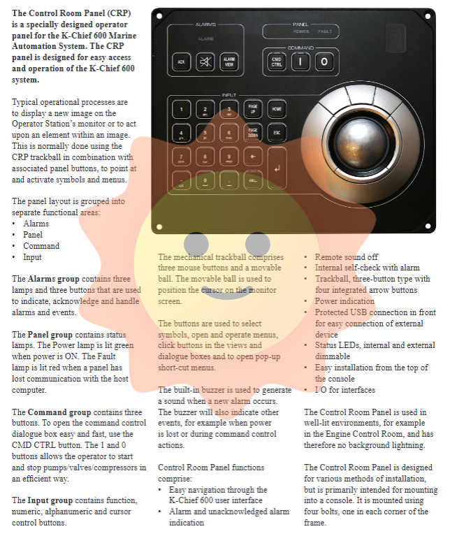 K-Chief 600 is a modular ship automation system launched by Kongsberg, covering core functions such as alarm monitoring, power management, pump control, and liquid level telemetry. The system adopts a distributed architecture, connecting various remote I/O units, controllers, and operation stations through a network to achieve comprehensive monitoring of ship power equipment and auxiliary systems. The control room panel, as an important component of the operation station, is usually installed on the platform of the control room, providing round the clock interaction means for the engineers.