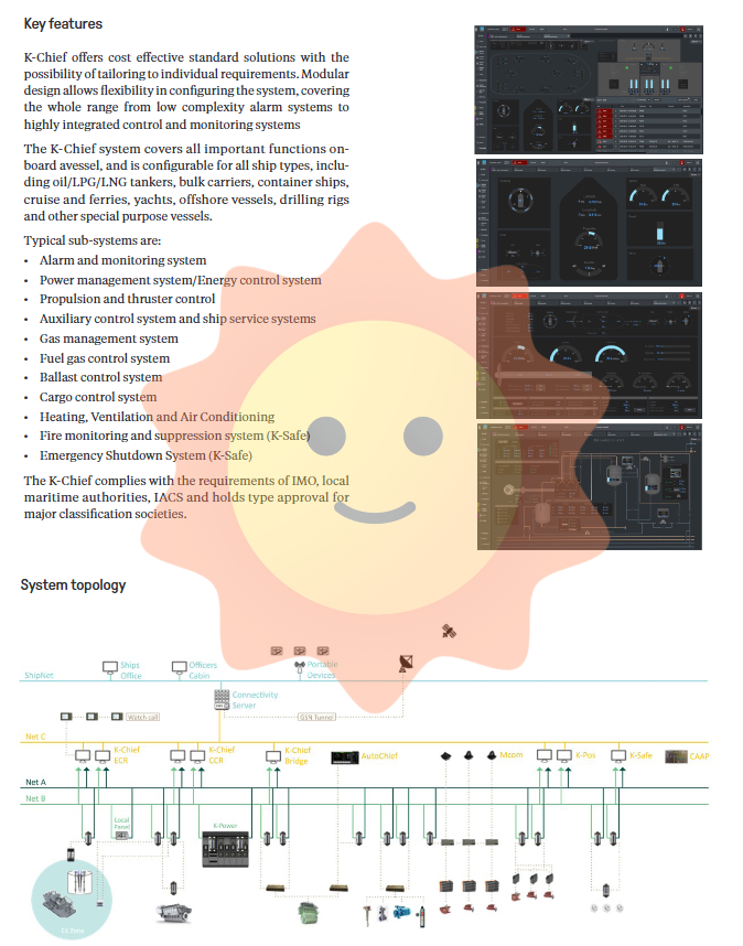 K-Chief system covers almost all key functions on the ship, and its powerful functionality is reflected through a series of subsystems, which can meet the needs of oil tankers, LNG/LPG ships, bulk carriers, container ships, cruise ships, offshore factory ship, drilling platforms and other ship types.