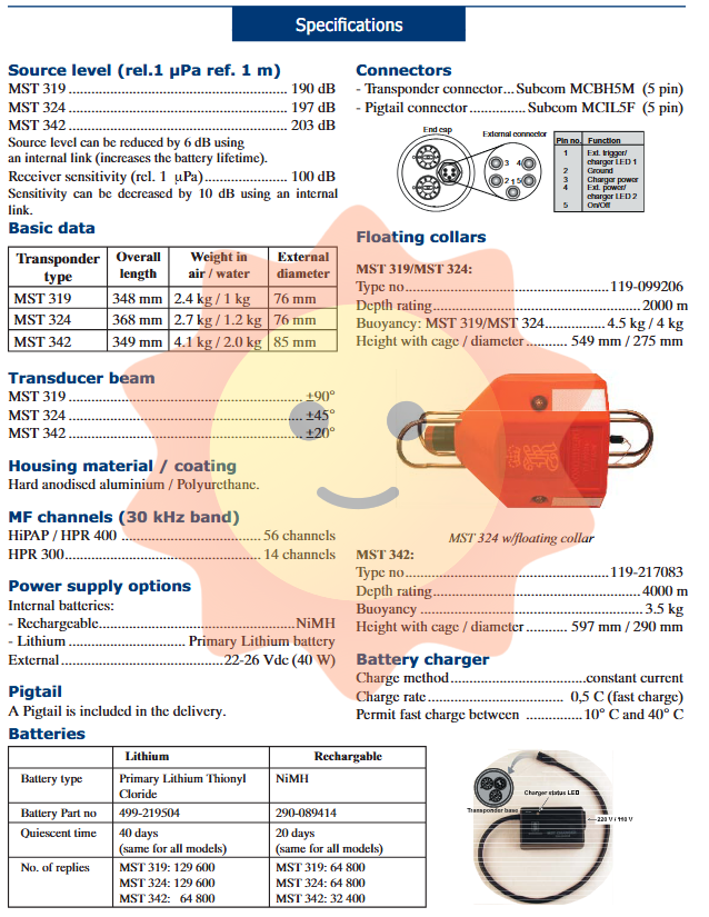 Taking "MST 319/N" as an example: 30kHz frequency band, 1000 meters depth, ± 90 ° beam, built-in rechargeable NiMH battery.