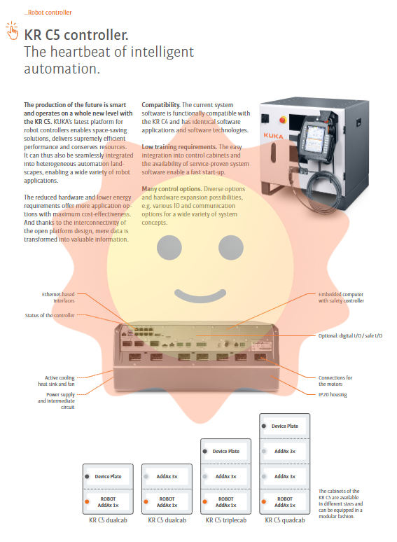 In this context, KUKA has launched the KR C5 controller platform. It is not just a hardware upgrade, but also an innovation in design philosophy. KR C5 is positioned as the 'heart of intelligent automation', emphasizing its core role in data flow, energy flow, and control flow. It not only needs to ensure the precision and efficiency of robot movement, but also become a hub for information gathering and distribution.
