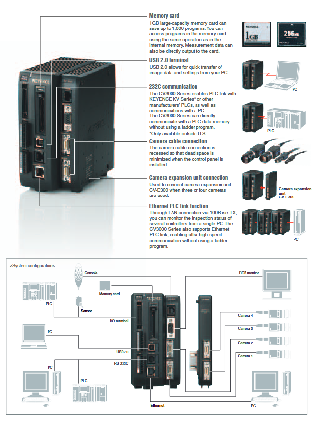 The CV-3000 series supports direct data connection with Keyence KV series and other brands of PLCs. Through the PLC linking function, there is no need to write any ladder diagram receiving program in the PLC, and CV-3000 can directly read and write data storage of the PLC. This feature supports 100BASE-TX Ethernet and enables high-speed and high-capacity data exchange.