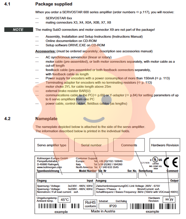 The SERVOSTAR 600 series has obtained UL 508C, UL 840 (file number E217428), and cUL certifications, meeting the requirements of the North American market. At the same time, it declares compliance with the EC EMC Directive (2014/30/EC) and the Low Voltage Directive (2014/35/EC), meeting the immunity requirements for industrial environments (Class 2) and the emission requirements for Class C3 products. However, as a component, the responsibility for the entire machine to comply with relevant directives (such as the Machinery Directive 2006/42/EC) after its final integration into the machine lies with the machine manufacturer.