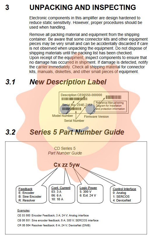 Depending on the system environment, it may be necessary to use clamp type ferrite cores on the I/O lines to attenuate unwanted signals. For CD series drives, in order to meet CE requirements, a specific magnetic core (such as Fair Rite 2643167251) must be applied on the 24V input power line and remote enable line (C3 connector pins 7&8), and wound around the constraint for 3 turns.