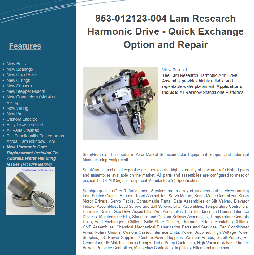 In addition to Lam Research harmonic drive components, SemiGroup also offers a wide range of semiconductor equipment refurbishment services, including: