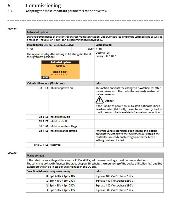 If the voltage on the motor nameplate is different from the grid voltage, the proportional relationship between C00173 (main power supply voltage) and C00015 needs to be adjusted.