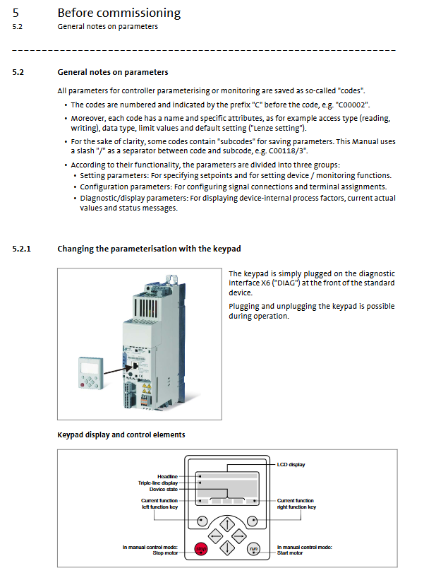 Check the direction of rotation. If the opposite is true, the motor U and V phases can be exchanged, or the logic of reversing DI4 through parameter C00114 (or using C00727/3 keyboard direction control) can be used.