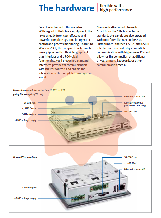 Compatibility is an important pillar of the L-force philosophy. The HMI EL 100 series is equipped with standardized industrial interfaces, including CAN bus (Lenze standard) MPI、RS232、 Ethernet, USB-A, USB-B, etc. These interfaces ensure industrial compatibility with higher-level PCs, allowing for the connection of additional drivers, printers, keyboards, or other communication devices to form a seamlessly integrated automation system.