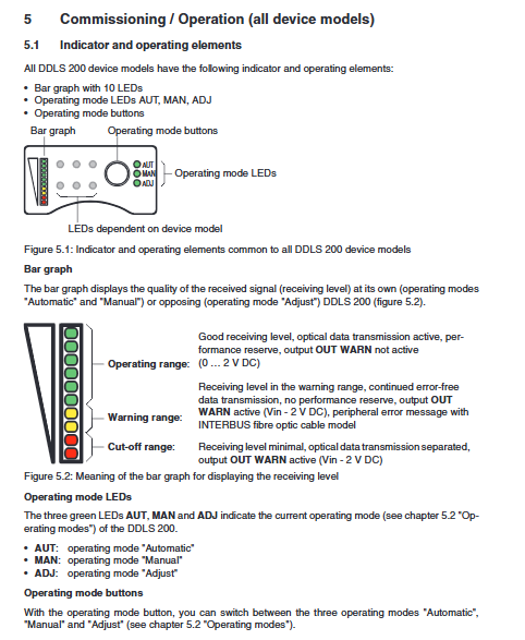 Yellow light area (usually 5-7 LEDs): Warning range, data can still be transmitted normally but there is no margin, OUT Warning activated (output Vin-2 V).