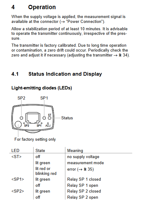 <ST>(Status): Green=Measurement Mode; Red or flashing red=malfunction; Extinguish=no power supply.