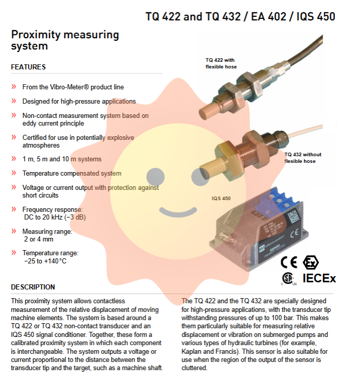 The TQ 422 and TQ 432 eddy current sensors, together with the IQS 450 signal conditioner, form a complete, factory calibrated proximity measurement system. This system is designed specifically for high-pressure applications, with sensor probes capable of withstanding pressures up to 100 bar, making it particularly suitable for monitoring key parameters of equipment such as submersible pumps, Kaplan turbines, Francis turbines, etc.