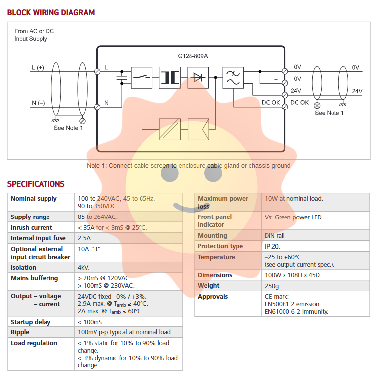 Installation: Ensure installation in a well ventilated location away from heat sources. Firmly mounted on a standard 35mm DIN rail.
