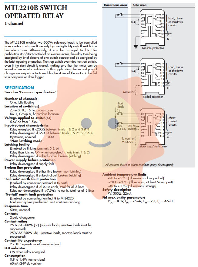 MTL2210B is a single channel device, but its internal logic is extremely rich. It can control two independent 500VA loads in the safe area simultaneously through a touch switch in the dangerous area. What is even more commendable is its built-in "self-locking" function: by short circuiting specific terminals, it can be configured as a standard motor start stop control circuit. The start switch is closed to close the relay and lock it, and the stop switch is opened to release the lock. More importantly, the stop command has absolute priority in logic. Even if the start circuit is in a short-circuit closed state, as long as the stop circuit is disconnected, the motor will still be reliably cut off, which fully complies with the safety operation regulations of heavy machinery. Its response time is only 50ms, and the contact life can reach 200000 times.