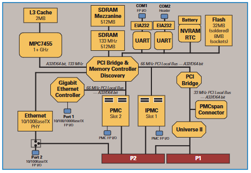 Bus and Expansion: Dual PCI bus and dual PMC sites, with a bus speed of up to 66 MHz; 64 bit PCI expansion mezzanine connector, capable of supporting up to four additional PMCs.