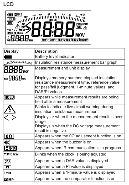 Factory default settings: such as Pass/Tail reference values for each voltage level (0.5M Ω for 500V level), default "ON" for backlight/buzzer, default clearing of memory, etc.