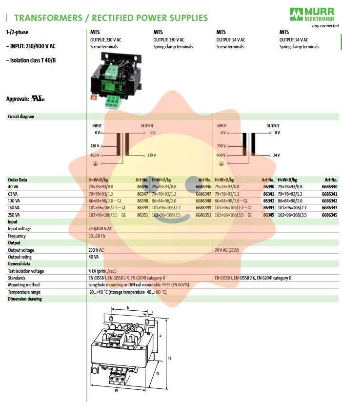 MTS, MST, MET, MTL and other series of transformers meet global market certification, with isolation levels reaching T 40/B or T 60/B. The input voltage covers single-phase 230/400 V AC and three-phase 208-550 V AC, and the output can provide various combinations such as 24 V AC, 230 V AC or 2 × 24 V AC. Rectified power supplies (such as the MEN series) convert AC power to 24 V DC (SELV), with a maximum ripple of 5% rms, and integrate LED, varistor, and smoothing capacitor. These products are installed using long holes or DIN rails, with a working temperature range of -20 to+60 ° C. Some models have obtained certification from the German Lloyd's Register (GL).