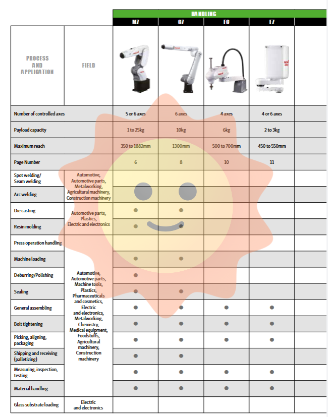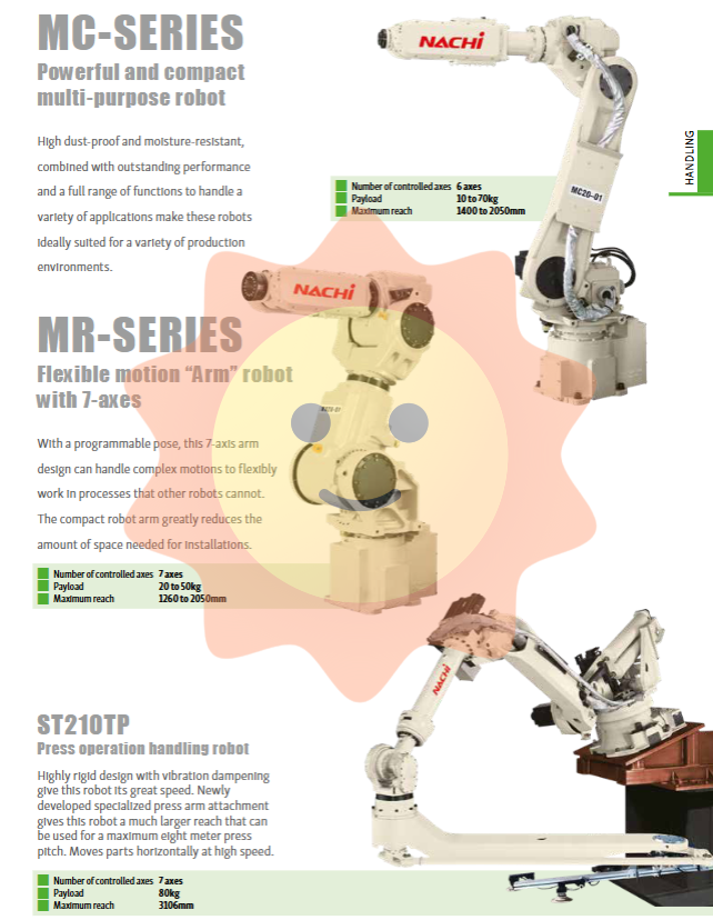 Since becoming Japan's first industrial robot manufacturer in 1968, NACHI-FUJIKOSHI has continuously launched robot products that integrate excellent technology and innovative capabilities, relying on its profound technical expertise in the fields of hydraulics and machine tools. After more than half a century of development, NACHI has established deep cooperative relationships with numerous automotive and general industrial enterprises around the world. Its robot products cover almost all industrial automation fields, from high-speed and high-precision small-scale operations to heavy material handling, from arc welding and spot welding to clean room handling, from palletizing to assembly and polishing.
