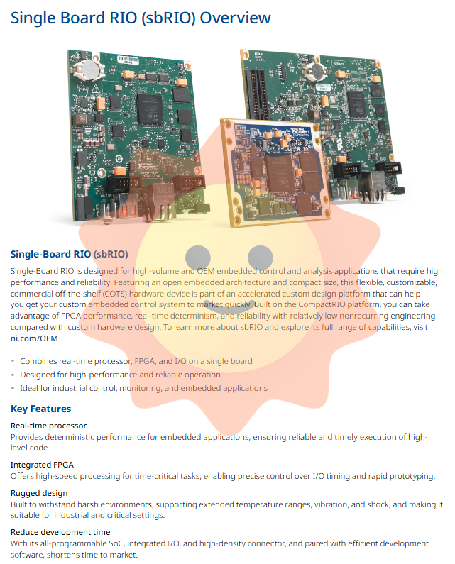 SbRIO is designed specifically for high-capacity OEM embedded control and analysis applications, integrating real-time processors, FPGAs, and I/O on a compact single board. It is part of an accelerated custom design platform that can help customers quickly bring embedded control systems to market. SbRIO is based on the CompactRIO platform, thus inheriting FPGA performance, real-time determinism, and reliability, while having lower non repetitive engineering costs compared to fully customized hardware designs.