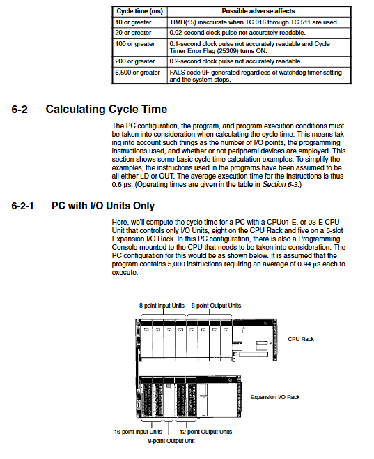 The cycle time of C200H includes: supervised processing+program execution+I/O refresh+peripheral services+link unit services (if any). Typical values: The supervision time of CPU01-E/03-E is 2.6ms, with a refresh time of 70 μ s for each input word and 40 μ s for each output word.