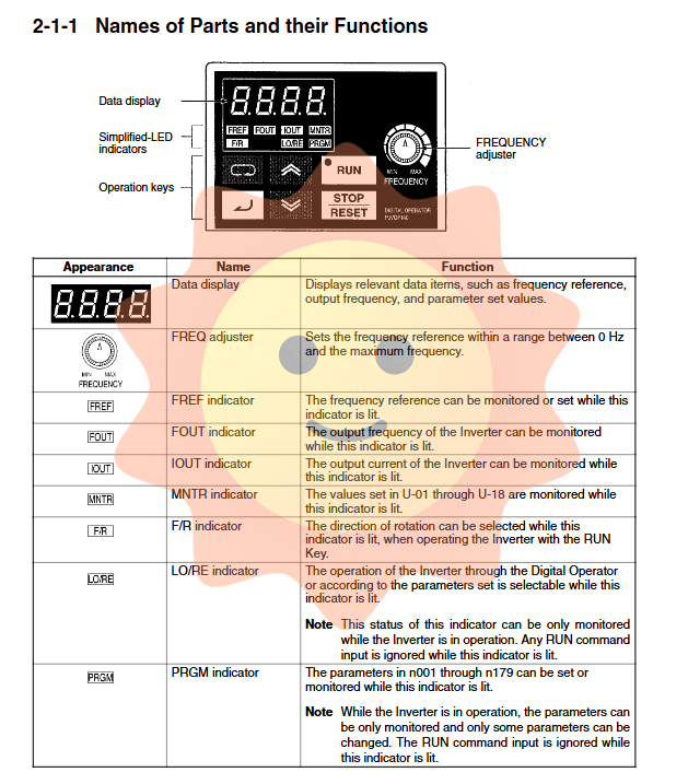 STP (Emergency Stop): An emergency stop signal is input through the multifunctional input terminal, or stopped by pressing the STOP button on the operator.