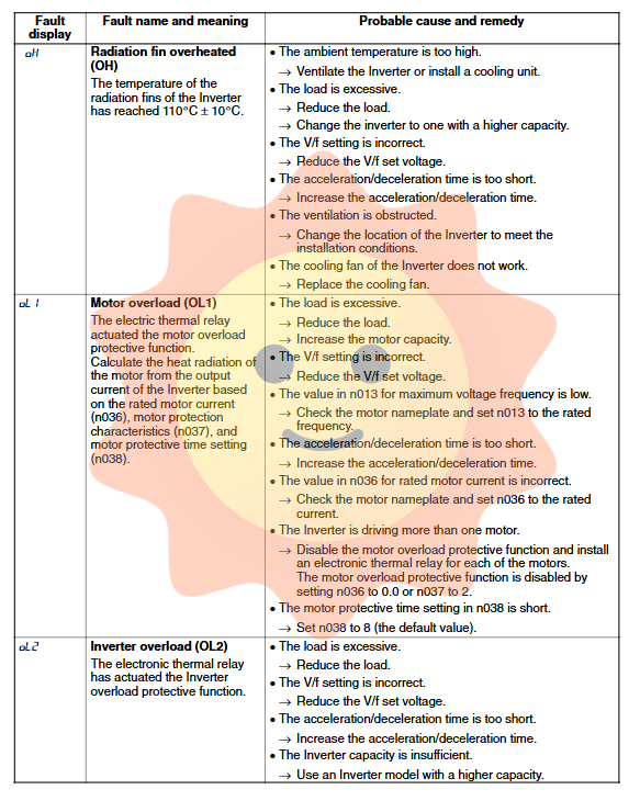 OL1 (motor overload): The electronic thermal relay is activated. The reasons may be excessive load, improper V/f setting, short acceleration and deceleration time, incorrect rated motor current setting, etc.