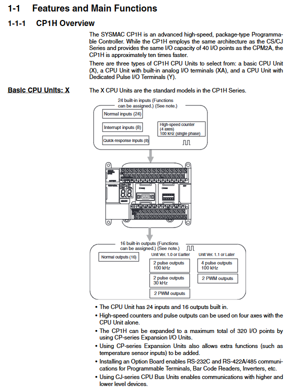 CP1H introduces the concept of Unit Version, with different versions having different functionalities. The unit version is marked on the nameplate and can be read through CX Programmer (Ver. 6.1 or above). The starting version of Y-shaped is 1.1, and the starting version of X/XA is 1.0. Version 1.1 increases the pulse output from 2-axis 100kHz+2-axis 30kHz to 4-axis 100kHz.