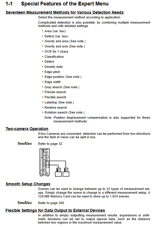 Omron F160-2 Vision Sensor is an embedded system designed for industrial inspection. Its Expert Menu provides 17 measurement methods, covering area, defect, center of gravity, edge, search, character recognition, classification, and almost all common machine vision needs. Compared with simple conversational menus, expert menus allow users to make fine adjustments to measurement areas, binary thresholds, filtering processing, output expressions, etc., making them particularly suitable for applications that require strict customization of detection logic, processing of complex workpieces, or data exchange with PLCs and robots.