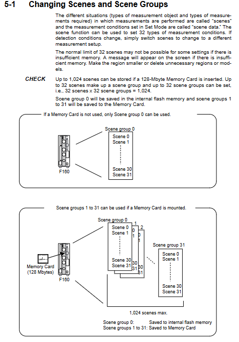 F160-2 allows up to 32 scenes to store different detection conditions. Scenario 0 is stored by default in internal flash memory, while Scenarios 1 to 31 require a Memory Card to be inserted for use. Scene Group packages 32 scenes, with a maximum of 32 scene groups and a total of 1024 scenes. Scene group 0 is still stored in flash memory, while scene groups 1 to 31 are stored on memory cards.