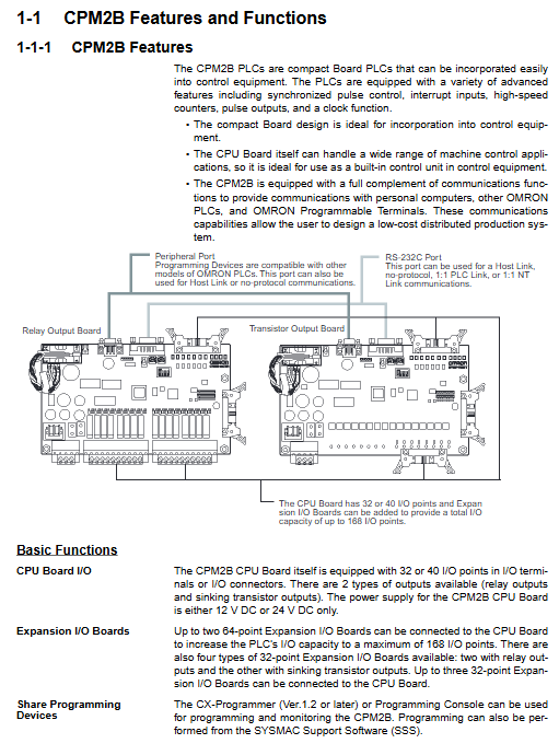 CPM2B CPU board is distinguished by I/O points, power supply voltage, and output type: