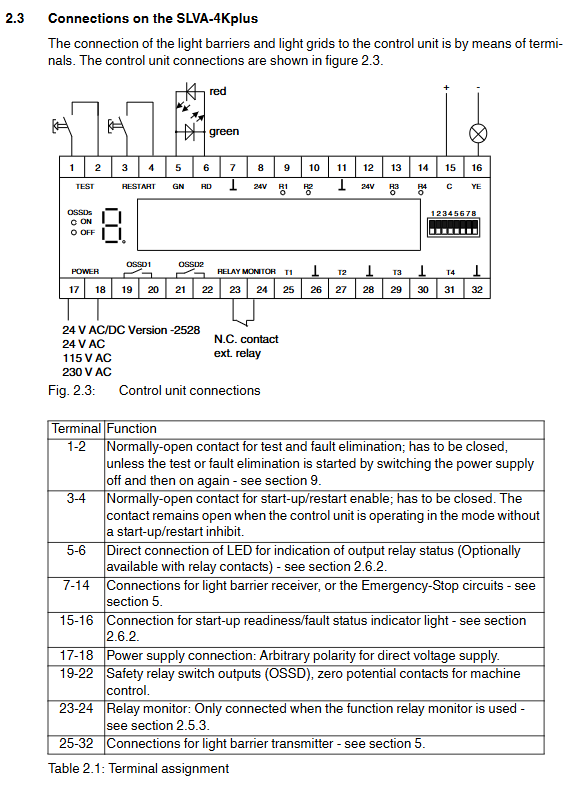 23-24 Relay Monitoring Input (EDM) is only used when the relay monitoring function is enabled, in series with external relay normally closed contacts