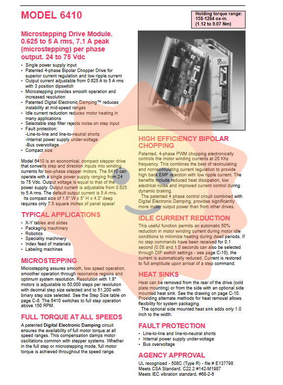 For standard 1.8 ° two-phase stepper motors, the 6410 supports step resolutions ranging from full steps (200 steps/rev) to 1/250 steps (50000 steps/rev).