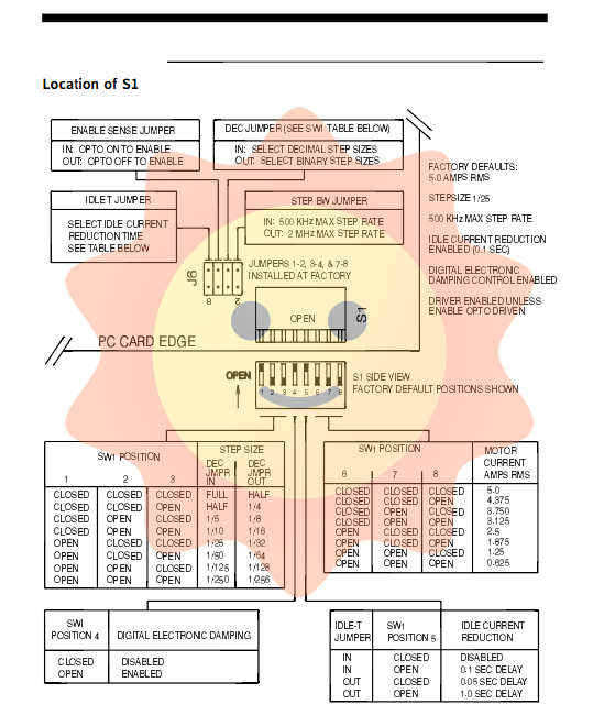 7-8: Idle current decay delay (in conjunction with S1-5: when J6 7-8 is installed, S1-5 closed=ICR disabled, S1-5 open=ICR enabled delay of 0.1 seconds); When J6 7-8 is removed, S1-5 closes with a delay of 0.05 seconds and opens with a delay of 1.0 seconds.