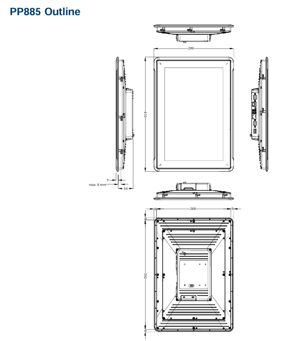 The contour diagram indicates the key dimensions of the operation panel (unit: mm), such as 286mm (partial length), maximum 8mm (related to installation plate thickness), 54mm (partial height), 268mm (partial length), 392mm (partial length), 410mm (overall length), etc. For detailed dimensions, please refer to the contour diagram in the manual.