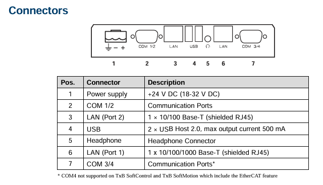 The drawings indicate the positions of connectors and related interfaces (such as COM1/2, LAN, USB, C LAN, COM3/4, etc.), but COM4 is not supported on TxB SoftControl and TxB SoftMotion that include EtherCAT functionality. For detailed interface layout and pin definitions, please refer to the illustrations in the manual.