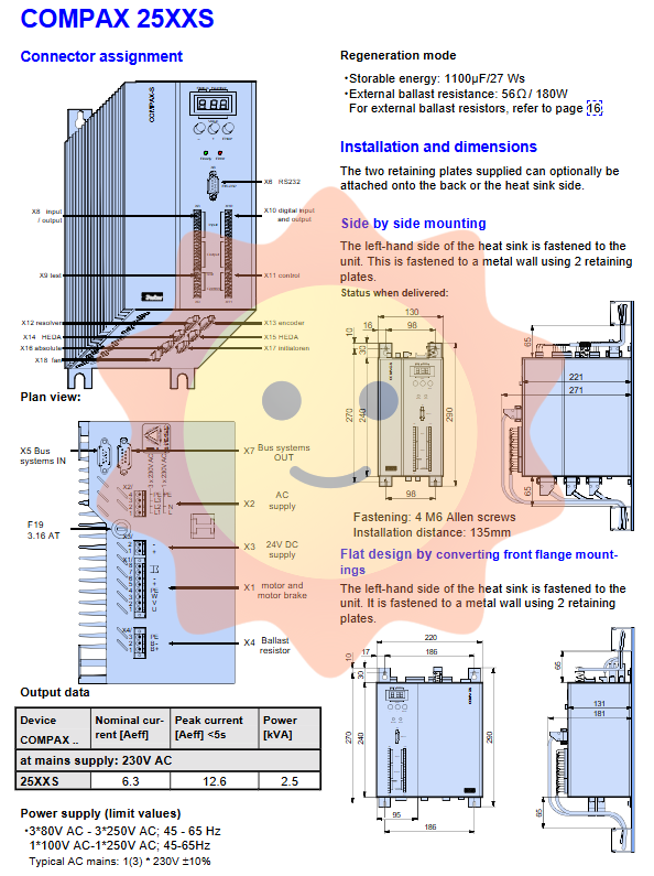 This model supports single-phase or three-phase 230V AC power supply, with a rated current of 6.3A effective value, a peak value of 12.6A, and a power of 2.5kVA. Its design is compact and can be installed side by side or wall mounted through the accompanying mounting plate, significantly saving control cabinet space. The internal energy storage capacitor is 1100 μ F and can absorb 27Ws of regenerative energy. The recommended external braking resistor is 56 Ω/180W. It is suitable for small and medium-sized packaging machinery, textile machinery, and simple handling systems.