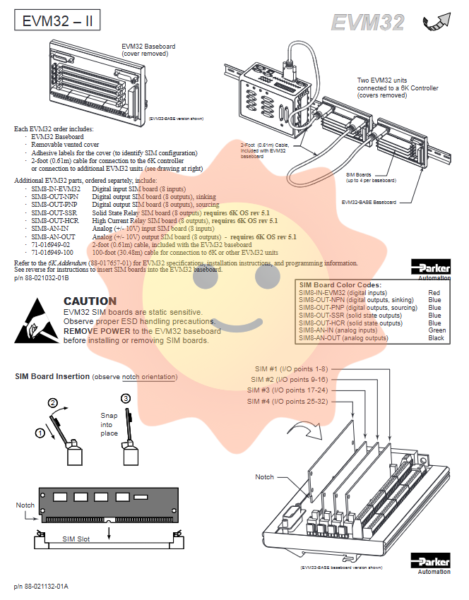 For detailed specifications, installation steps, wiring diagrams, and programming information about EVM32, please refer to the 6K Controller Supplemental Manual (document number 88-017657-01). This supplementary manual provides register mapping for each SIM board, address allocation for input-output buffers, and example code on how to access these extended I/Os in the 6K motion program. Users should note that some SIM boards (such as SSR, HCR, and analog output boards) require the operating system version of the 6K controller to be no less than 5.1. Before ordering these boards, it is recommended to check the firmware version of the existing 6K controller and upgrade it if necessary to ensure compatibility.